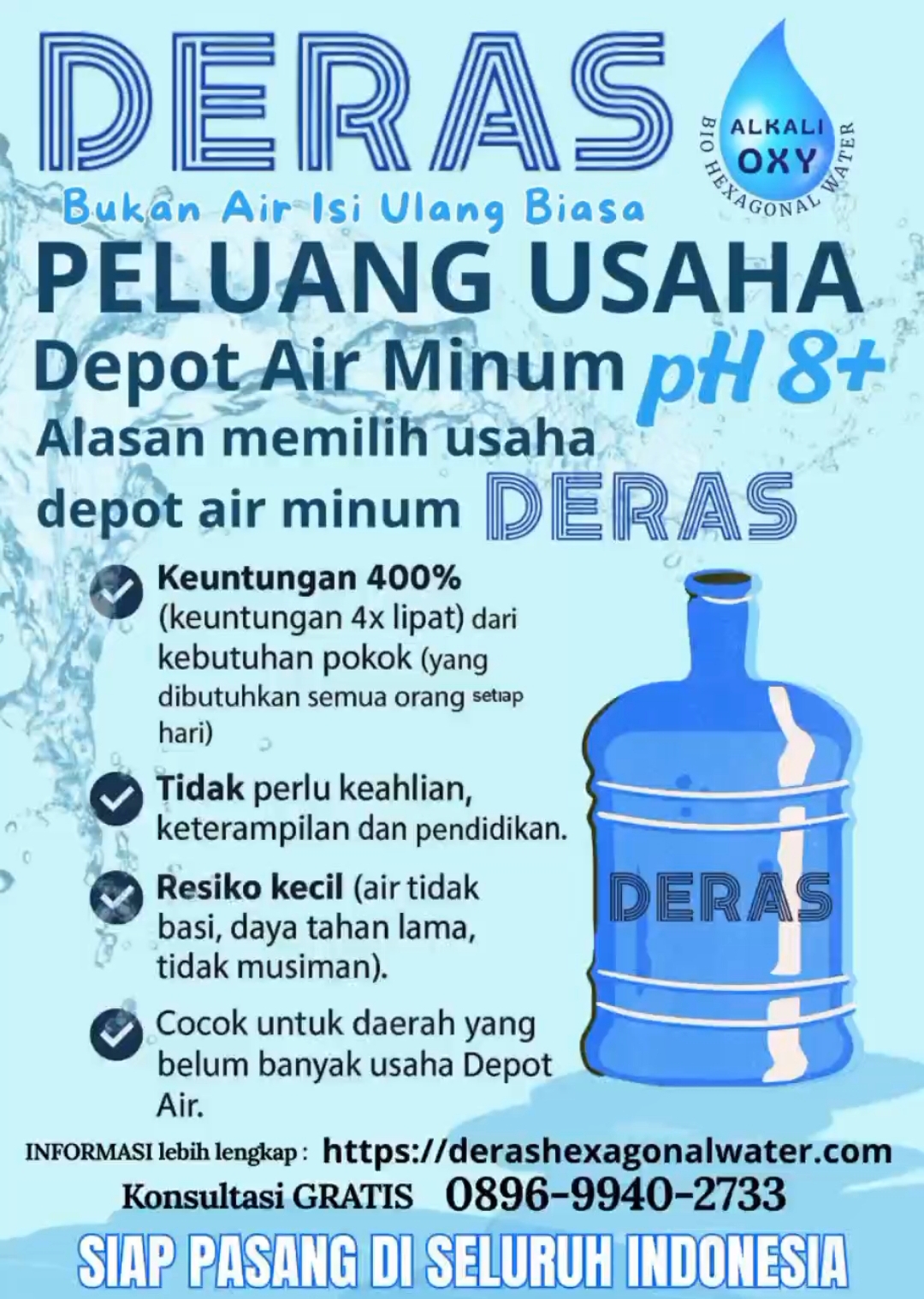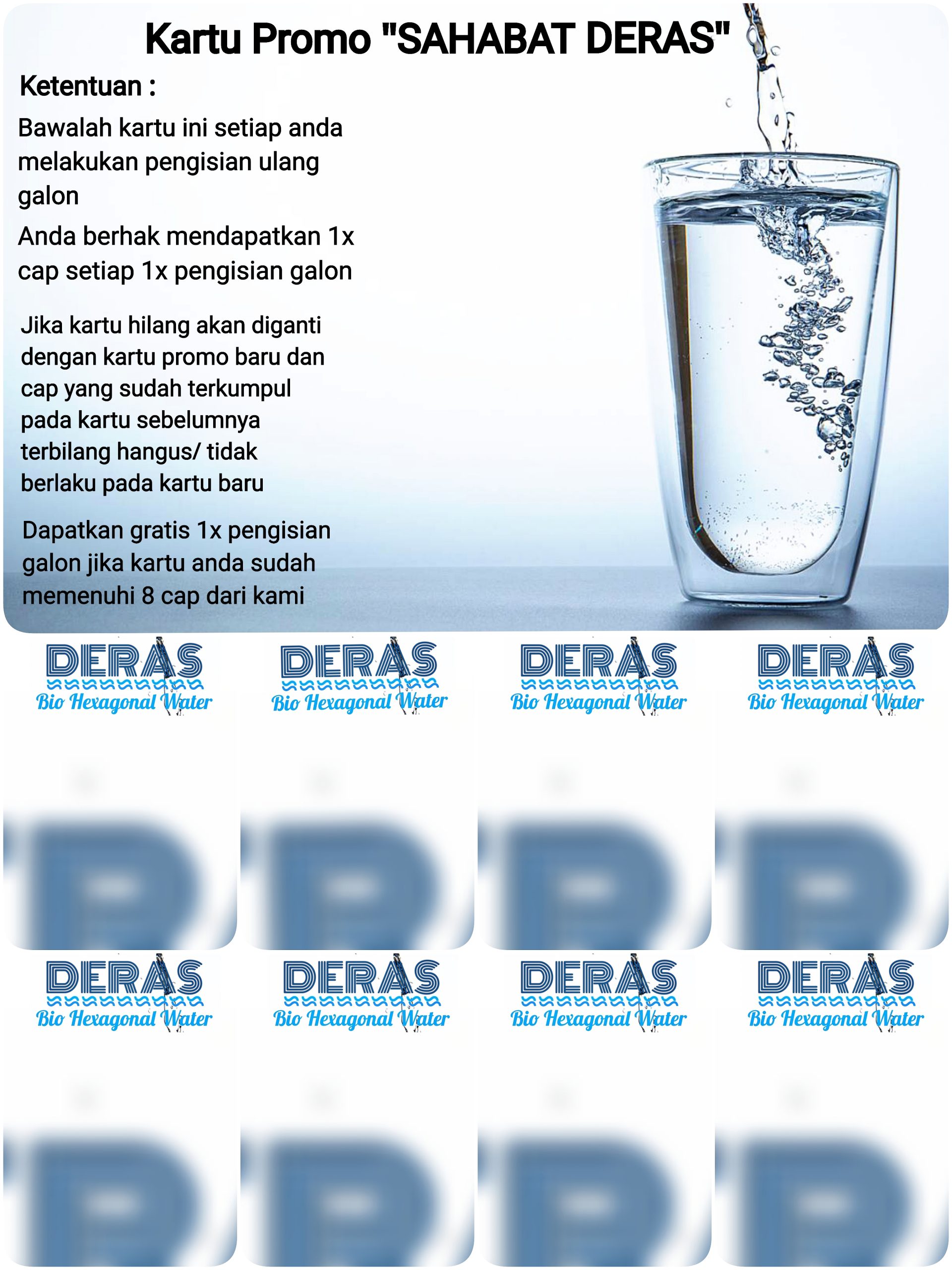 DERAS adalah sebuah merek depot air minum isi ulang berjenis Bio Hexagonal Water dibawah naungan dan pemantauan dari CV. DERAS JAYA